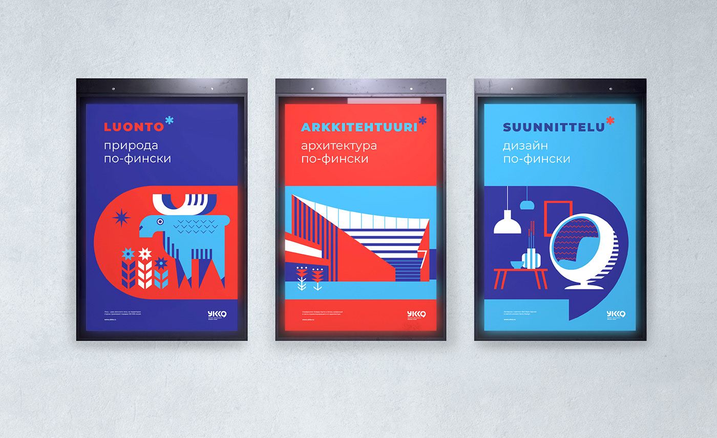 一系列廣告海報設(shè)計-也是基于芬蘭文字。帶有插圖的框架被組合成一個企業(yè)對話云。海報設(shè)計代表了芬蘭著名的屬性(芬蘭自然-麋鹿,建筑-阿爾托大學(xué),設(shè)計-芬蘭內(nèi)部項(xiàng)目)。