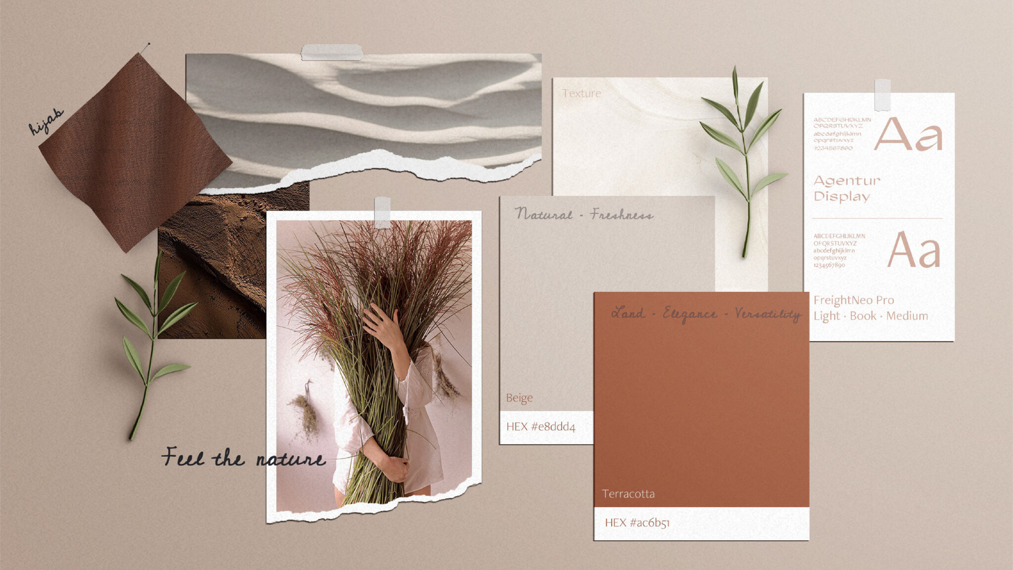 品牌形象設(shè)計(jì)中顏色調(diào)色板是基于中性色調(diào)的頭巾,以及女性化的一面的品牌。除了這些特點(diǎn),北歌色調(diào)傳達(dá)自然,并與自然生物降解織物。反過(guò)來(lái),粉紅色調(diào)尋求更女性化的一面,甜蜜,浪漫。