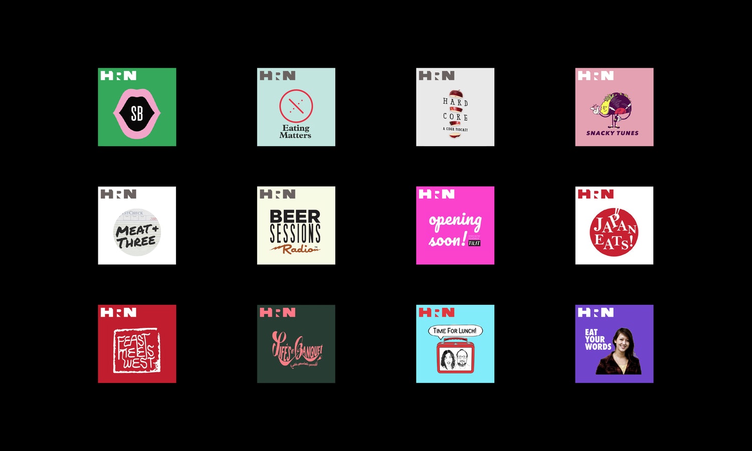 這個新的標(biāo)志設(shè)計突出了HRN的首字母縮寫,就像廣播電臺的呼號一樣,并在整個網(wǎng)絡(luò)的內(nèi)容中建立了一個可識別的品牌。該標(biāo)志設(shè)計中故意中立,避免與食物有關(guān)的圖像,以適應(yīng)各種各樣的節(jié)目。這個標(biāo)記有正反兩部分,一個看不見的“R”以強“H”和“N”為中心。頂部的“H”是一個負(fù)面的襯線從“R”,創(chuàng)造了一個獨特的角度,作為一個反復(fù)出現(xiàn)的圖形主題在整個品牌形象設(shè)計