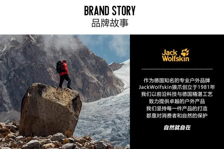 品牌寓意:品牌名Jack Wolfskin寓意對最高的產(chǎn)品要求和對野外最美好的向往,也意為大自然里最厲害的保護(hù)層。
